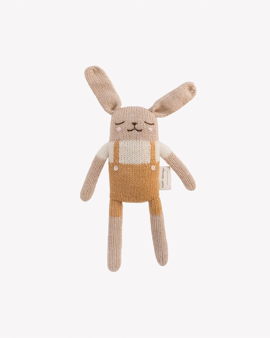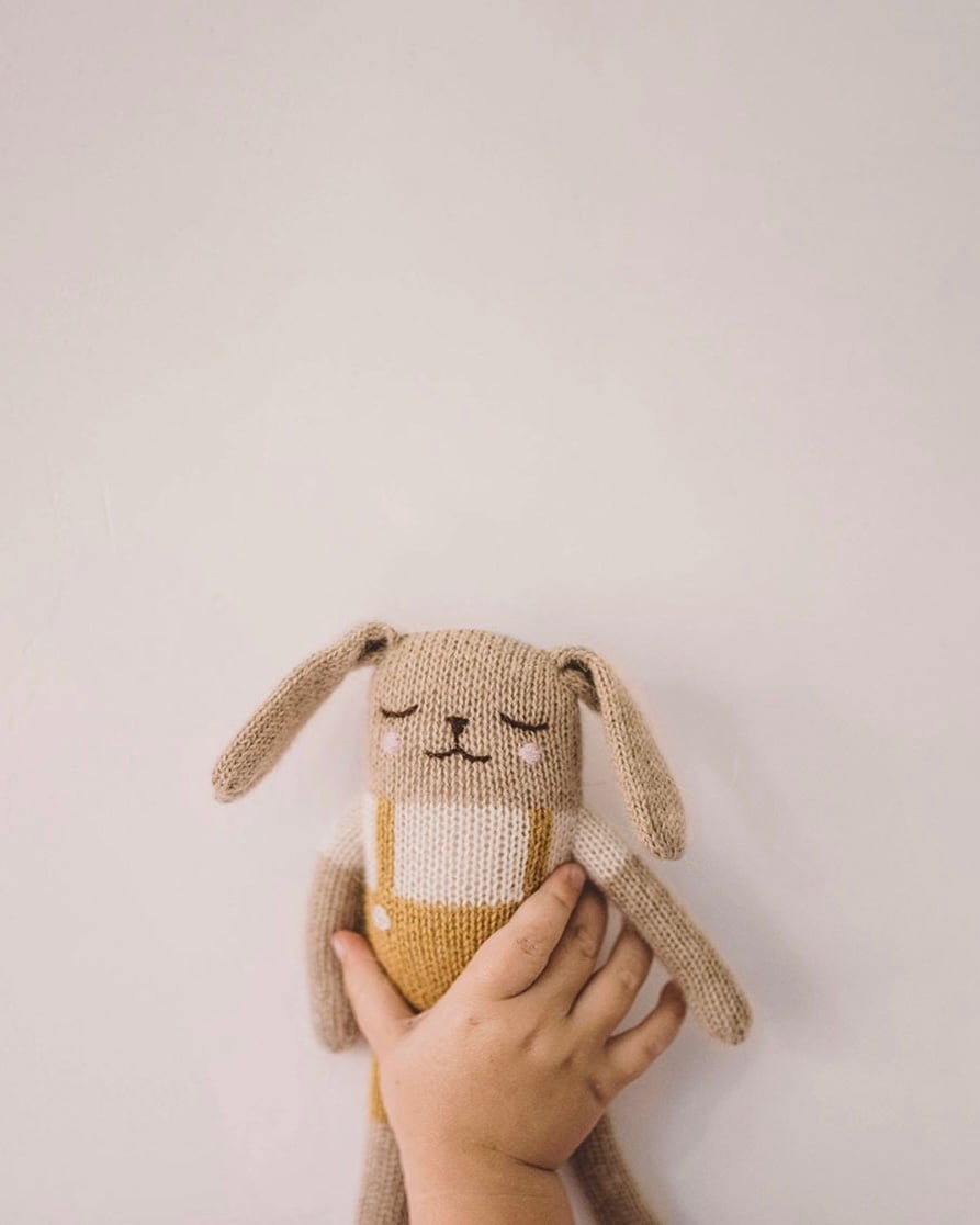 Doudou lapin MAIN SAUVAGE, un de nos lapins best-seller, celui qui plaira à coup sûr ! Tricoté et brodé à la main avec beaucoup d’attention, il fera un joli cadeau pour un tout petit, à garder toute une vie. Il est réalisé en pure laine baby alpaga, une matière antibactérienne très douce, particulièrement adaptée aux peaux sensibles des bébés.